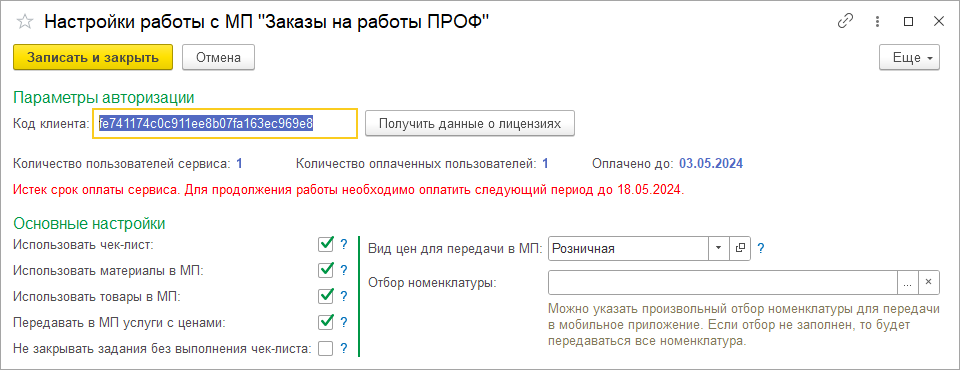 Вид цен для передачи в МП – если указан тип цен, то в МП будет передаваться прайс-лист на услуги и товары. Это позволяет вашему сотруднику оперативно информировать клиента о ценах на запрошенную номенклатуру.