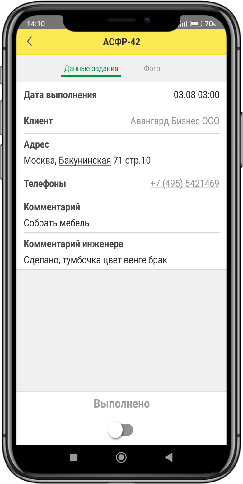 В карточке задания исполнитель получает необходимую информацию о клиенте, его телефоне, адресе выполнения работ, списке работ, сроке исполнения и комментарии диспетчера.