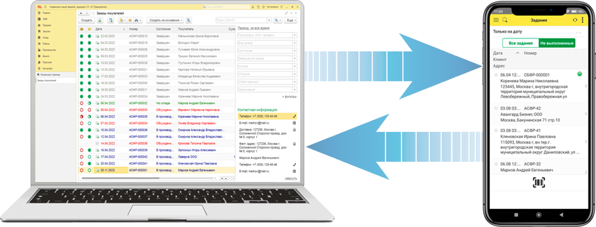 Заказы выгружаются в мобильное приложение персонально для каждого исполнителя. Из мобильного приложения в базу 1С возвращается информация о статусе выполнения заказов, комментарии исполнителей, фотографии работ и документов.