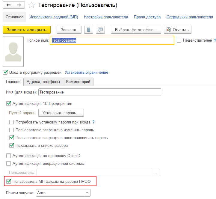На закладке Исполнитель должен быть указан пользователь Тестирование и он был назначен основным.