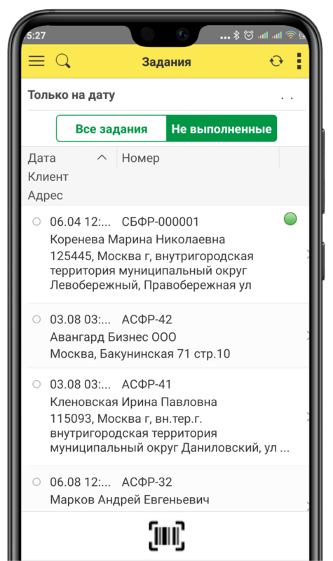 Отображение списка задач можно изменять, показывая все задачи или только не выполненные. Зеленый кружочек рядом с задачей означает, что изменения по задаче отправлены в 1С, красный - не отправлены.