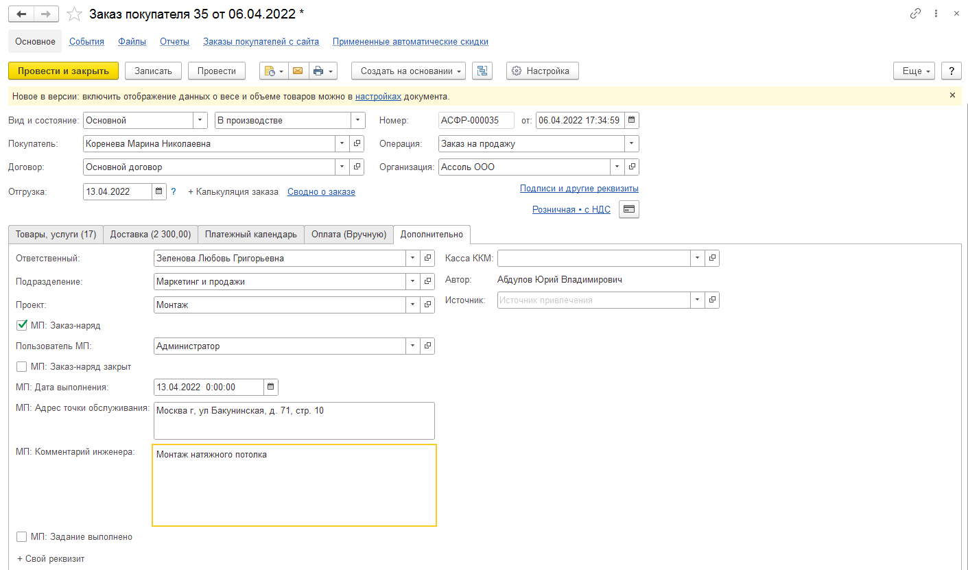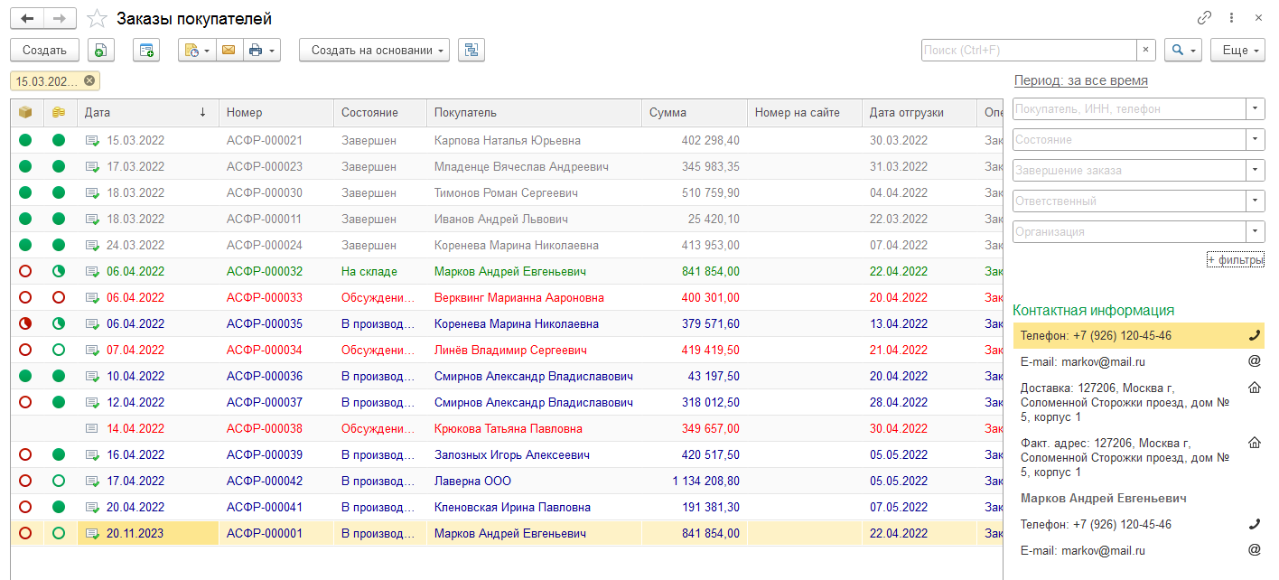 Диспетчер в базе 1С оформляет заказы.