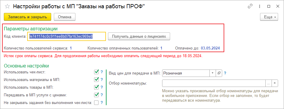 Для проверки текущего оплаченного периода и оплаченных лицензий в настройках серверной части нажмите кнопку «Получить данные о лицензиях». В поле Количество пользователей сервиса - отображается количество пользователей, у которых установлен флаг «Пользователь МП Планизатор». Обратите внимание, что для выбора исполнителя в документе Заказ-наряд возможен только пользователя, у которого установлен флаг «Пользователь МП Планизатор». Также передача данных в МП возможна только для исполнителей у которых установлен флаг «Пользователь МП Планизатор». Т.е. если пользователь был указан в качестве исполнителя, но потом у него убрали флаг «Пользователь МП Планизатор», то данные к нему в мобильное приложение не придут – будьте внимательны!