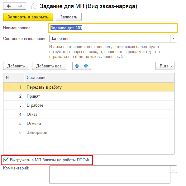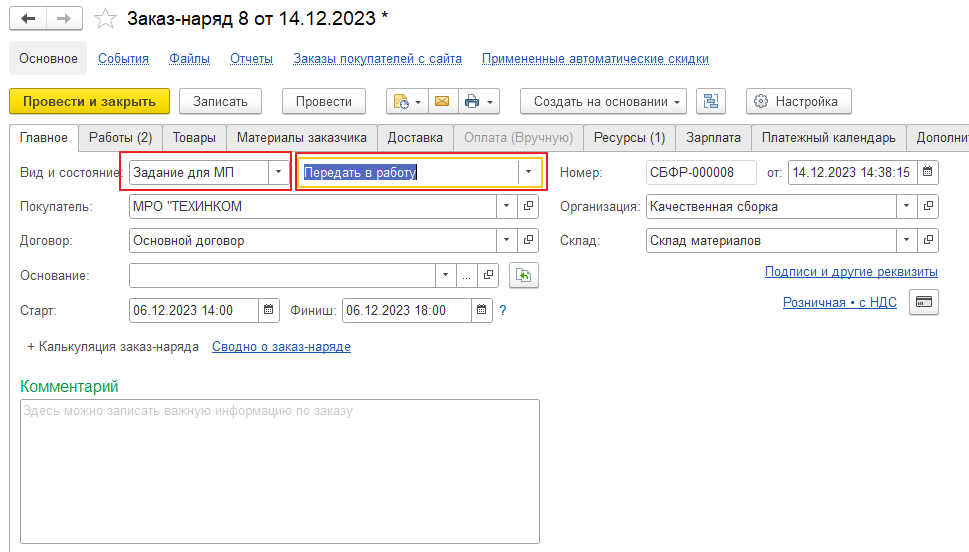 Вид и состояние было выбрано – Задание для МП, Передать в работу