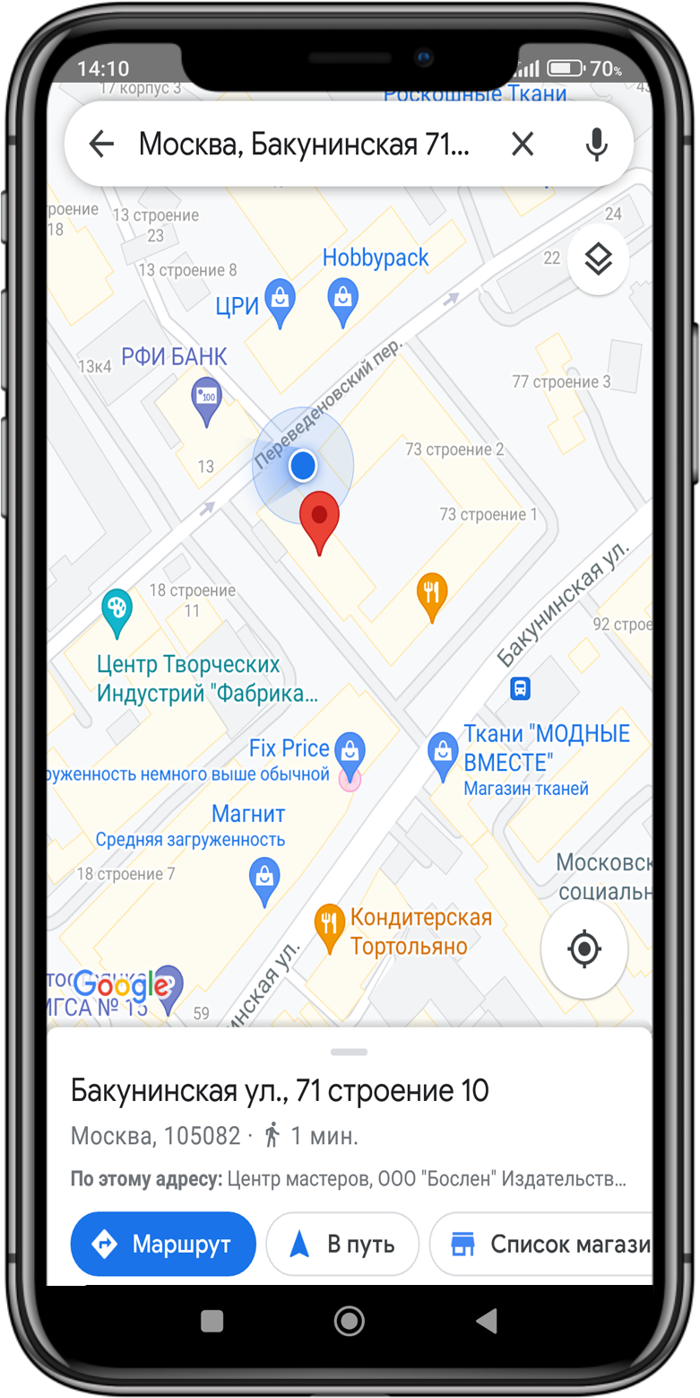 При нажатии на адрес вызывается приложение с картой для прокладки маршрута. Это может быть Яндекс-карта, Яндекс-навигатор или Гугл-карта.