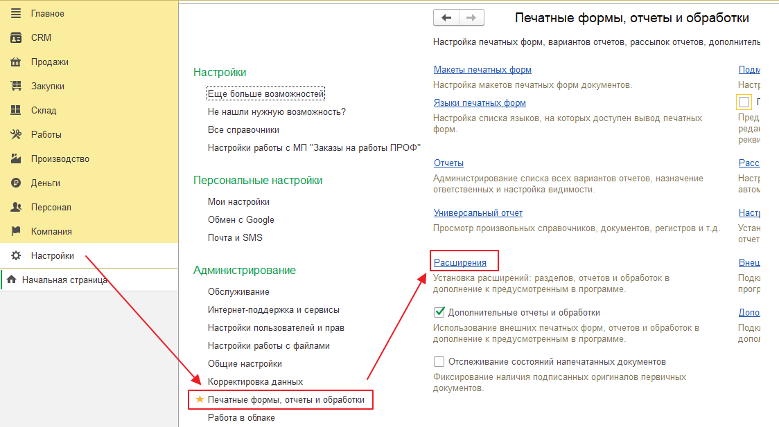 Откройте Настройки – Печатные формы, отчеты и обработки – Расширения (Рисунок 1 )